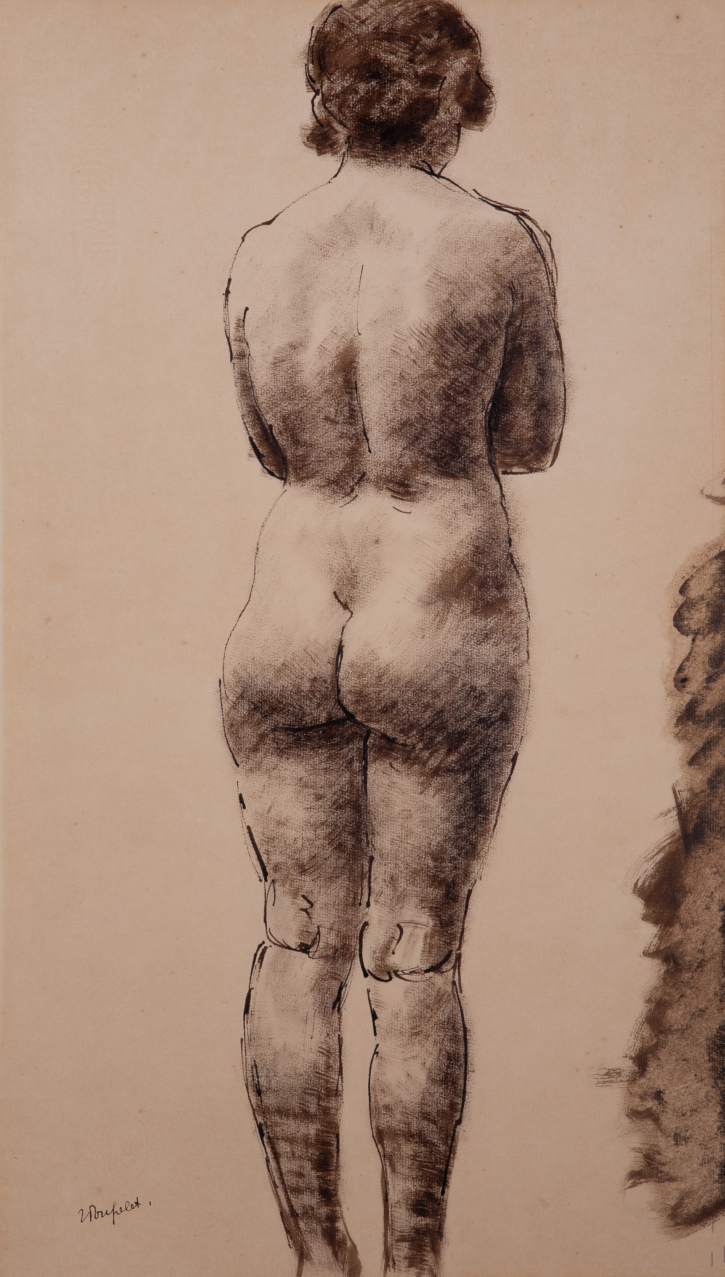 Jane Poupelet's drawings are rarely preparatory studies for sculpture, but rather autonomous works that nevertheless display all the characteristics of statuary art. Our nude is treated with a very three-dimensional vision of forms, specific to ‘sculptor's drawing’. The silhouette is outlined with a fine pen stroke, while the modelling is constructed through dense hatching and shading with walnut ink, a natural dye that the artist particularly appreciated for its local, rustic character and ease of supply. The light brings out all the nuances of this architecture, enhancing the prominent parts of the body with subtle touches.